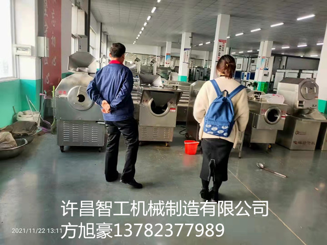 11月22日,湖北客户一行2人来到许昌智工机械制造有限公司试机小型电磁炒货机炒制栗子。